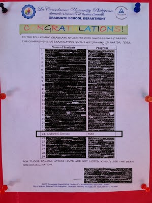 It was last January when I took this 2 days Examination for me to be able to enter Thesis Writing scheme and after 2 weeks February 16, 2013 I luckily passed that extensive exam. I think, it was my first great news for 2013 as not all of us passed and to think that I came from work that time without any sleep taking that 8 hours a day exam and then, I still passed. Thankfully.